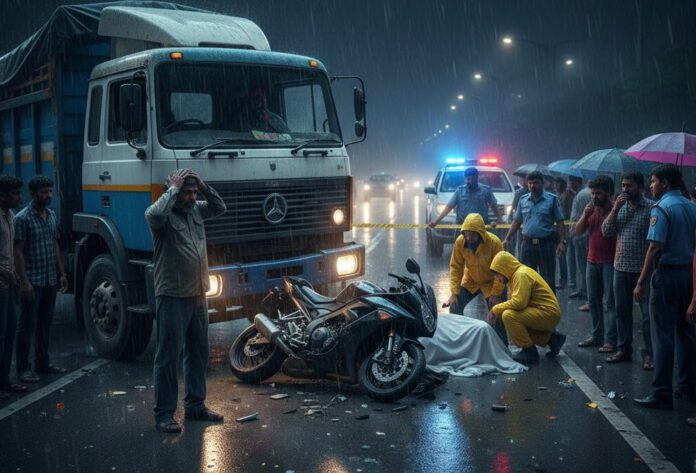 இறந்தவர் ஓட்டிச் சென்ற மோட்டார் சைக்கிள் எதிர் திசையில் இருந்து வந்த லாரியுடன் மோதியதால் இந்த விபத்து நிகழ்ந்துள்ளது.