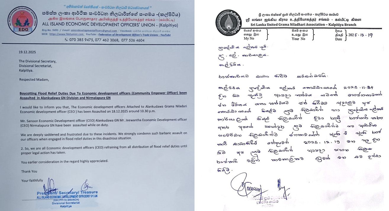 இலங்கை ஐக்கிய கிராம உத்தியோகத்தர் சங்கத்தின் கற்பிட்டி கிளையும், அகில இலங்கை பொருளாதார அபிவிருத்தி உத்தியோகத்தர்கள் சங்கத்தின் கற்பிட்டி கிளையும் இன்று வெள்ளிக்கிழமை வெளியிட்டுள்ள அறிக்கையில் இவ்வாறு குறிப்பிடப்பட்டுள்ளது.