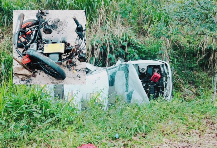 விபத்துக்குள்ளான குறித்த கார் பள்ளத்தில் கவிழ்ந்ததுடன், மோட்டார் சைக்கிள் தீப்பற்றியதாகவும் குறிப்பிடப்படுகின்றது.