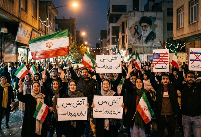 போர் நிறுத்த அறிவிப்பு வெளியான நள்ளிரவிலேயே, ஈரானின் தலைநகர் டெஹ்ரான் உள்ளிட்ட முக்கிய நகரங்களில் மக்கள் தேசியக் கொடிகளுடன் குவியத் தொடங்கினர்.