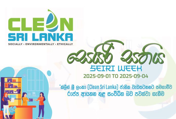 பொது சேவையின் செயல்திறன் மற்றும் உற்பத்தித்திறனை அதிகரிக்கும் நோக்கில், அனைத்து அரசு நிறுவனங்களையும் இலக்காகக் கொண்டு, ‘க்ளீன் ஸ்ரீலங்கா’ தேசிய திட்டத்தின் கீழ், இன்று (01) முதல் 04 ஆம் தேதி வரை ‘சேயிரி வாரம்’ என்ற சிறப்புத் திட்டத்தை செயல்படுத்த அரசாங்கம் முடிவு செய்துள்ளது.