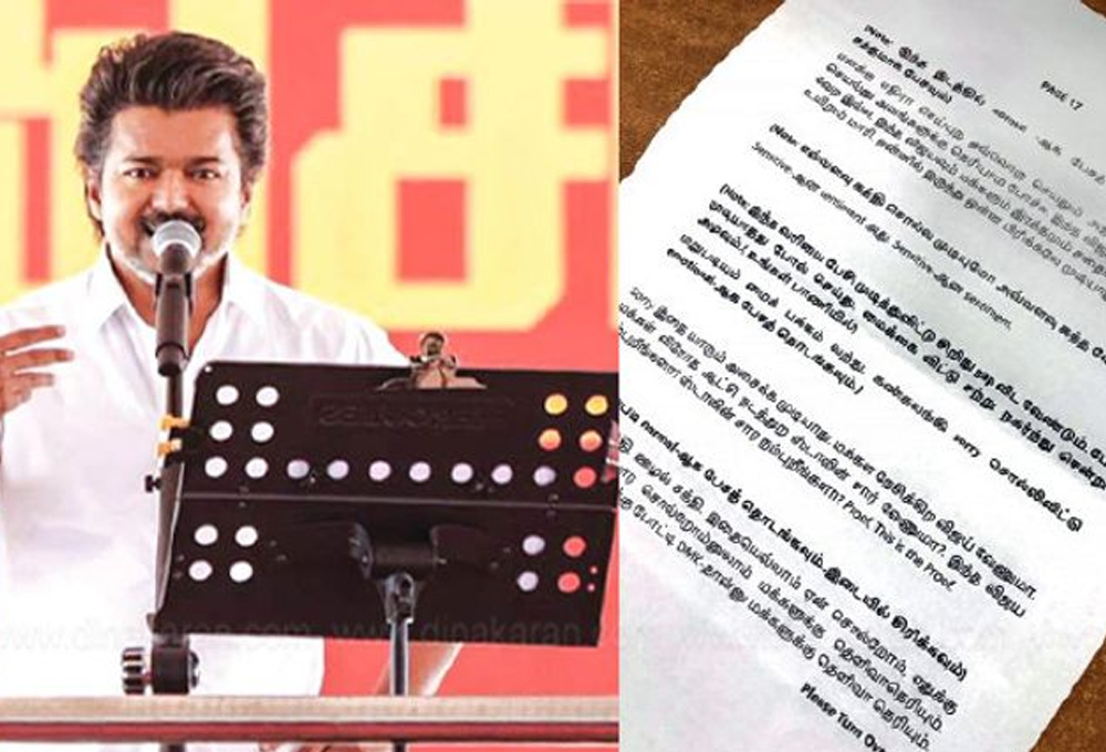 அது உண்மைதான் என்பதை அவரது ஸ்கிரிப்ட் காட்டிக்கொடுத்துள்ளது. விஜய் பேசுவதற்காக எழுதி கொடுத்த ‘ஸ்பீச் காபி’ தற்போது சமூக வலைதளங்களில் வெளியாகி வைரலாகி வருகிறது.