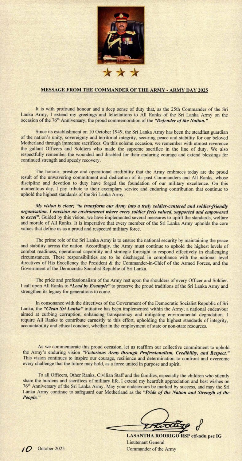 இலங்கை இராணுவத்தின் 25வது தளபதியாக, இலங்கை இராணுவத்தின் அனைத்துப் படைவீரர்களுக்கும் 76வது ஆண்டு நிறைவை முன்னிட்டு, “தேசத்தின் பாதுகாவலரின்” பெருமைமிக்க நினைவு தினத்தை முன்னிட்டு எனது வாழ்த்துக்களையும் பாராட்டுகளையும் தெரிவித்துக் கொள்கிறேன் என இராணுவத் தளபதி லசந்த ரொட்ரிகோ தெரிவித்துள்ளார்.
