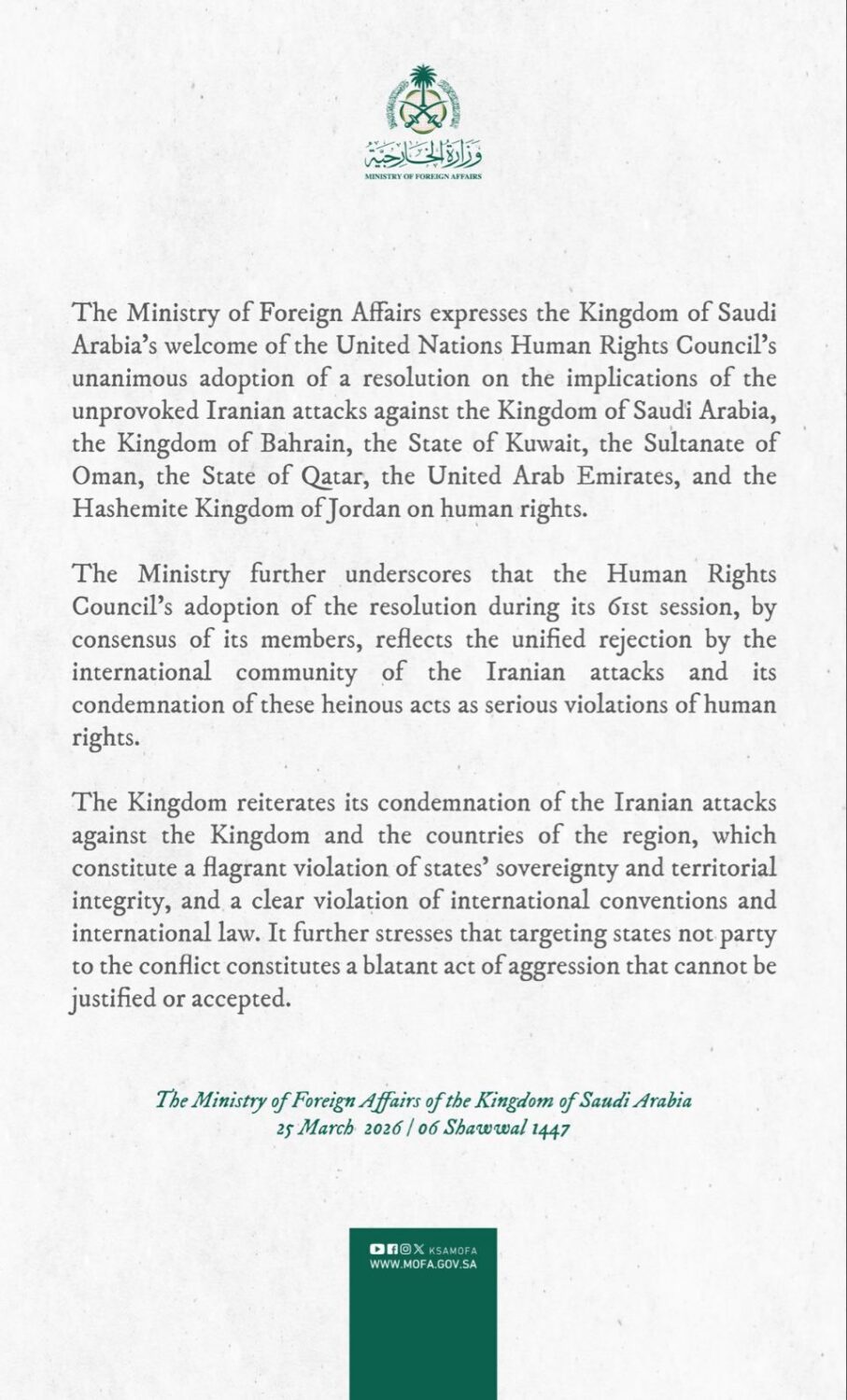 சவுதி அரேபியா, பஹ்ரைன், குவைத், ஓமான், கத்தார், ஐக்கிய அரபு அமீரகம் மற்றும் ஜோர்டான் ஆகிய நாடுகளுக்கு எதிராக ஈரான் நடத்திய தூண்டப்படாத தாக்குதல்கள் மற்றும் அதனால் மனித உரிமைகளில் ஏற்படும் தாக்கங்கள் குறித்த தீர்மானத்தை, ஐக்கிய நாடுகள் மனித உரிமைகள் பேரவை ஒருமனதாக ஏற்றுக்கொண்டதை சவுதி அரேபிய வெளியுறவு அமைச்சகம் வரவேற்கிறது.