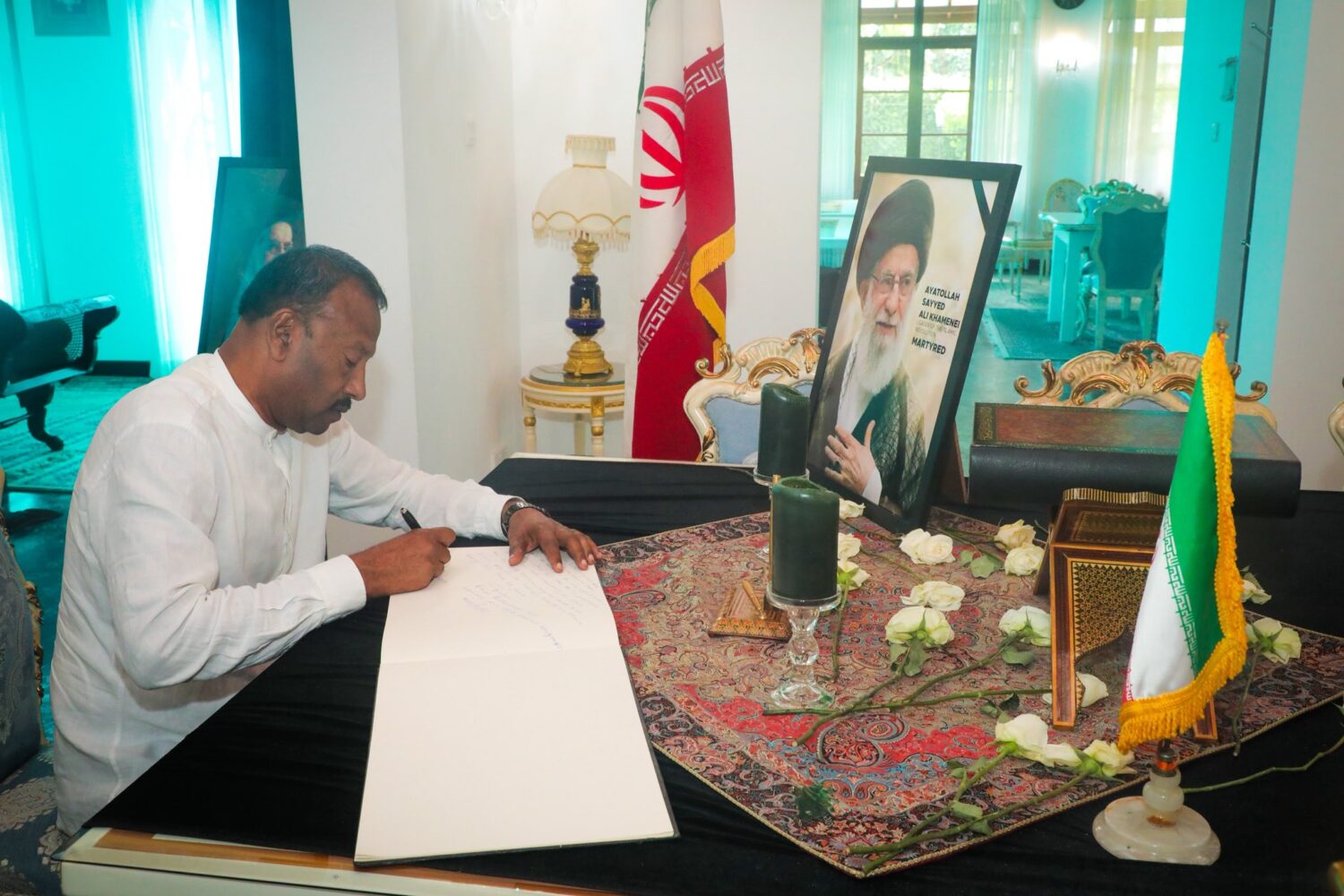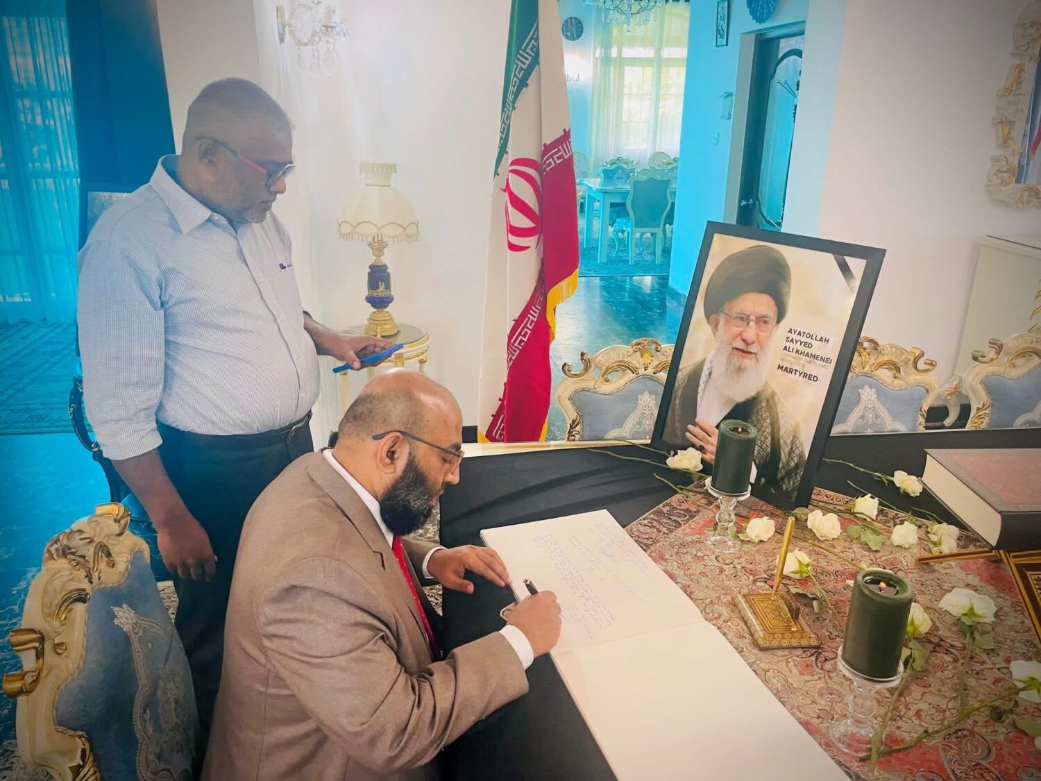 இன்று (05) கொழும்பிலுள்ள ஈரான் தூதரகத்திற்கு விஜயம் மேற்கொண்டு, அங்குள்ள தூதுவர் அலிடெர்ஷா டெல்கொஷ்வை சந்தித்து தனது அனுதாபத்தைத் பகிர்ந்துகொண்டதுடன், இரங்கல் பதிவேட்டிலும் தமது இரங்கல் செய்தியை பதிவு செய்தனர்.