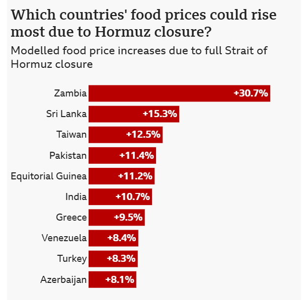 மேலும், ஜெர்மனியின் கீல் ஆராய்ச்சி நிறுவனம்(Kiel Research Institute), ஹோர்முஸ் நீரிணை முழுமையாக மூடப்பட்டால், உலகளாவிய கோதுமை விலை 4.2% ஆகவும், பழங்கள் மற்றும் காய்கறிகளின் விலைகள் 5.2% ஆகவும் உயரக்கூடும் எனக் குறிப்பிடுகிறது.