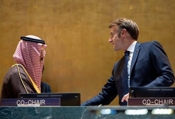நியூயார்க் நகரில் உள்ள ஐக்கிய நாடுகள் சபை பொதுச் சபையின் தலைமையகத்தில் நடைபெற்ற, அமைதியான வழிமுறைகளுடன் பாலஸ்தீனத்தின் நல்லிணக்கம் மற்றும் இரு மாநில தீர்வை செயல்படுத்துவதற்கான சர்வதேச மாநாட்டின் தொடக்க அமர்வு பிரெஞ்சு குடியரசின் மேதகு ஜனாதிபதி இம்மானுவேல் மக்ரோன் அவர்களின் பங்குபற்றலுடன் சவூதி வெளிவிவகார அமைச்சர் இளவரசர் பைசல் பின் ஃபர்ஹான் தலைமையில் ஆரம்பமாகியது.