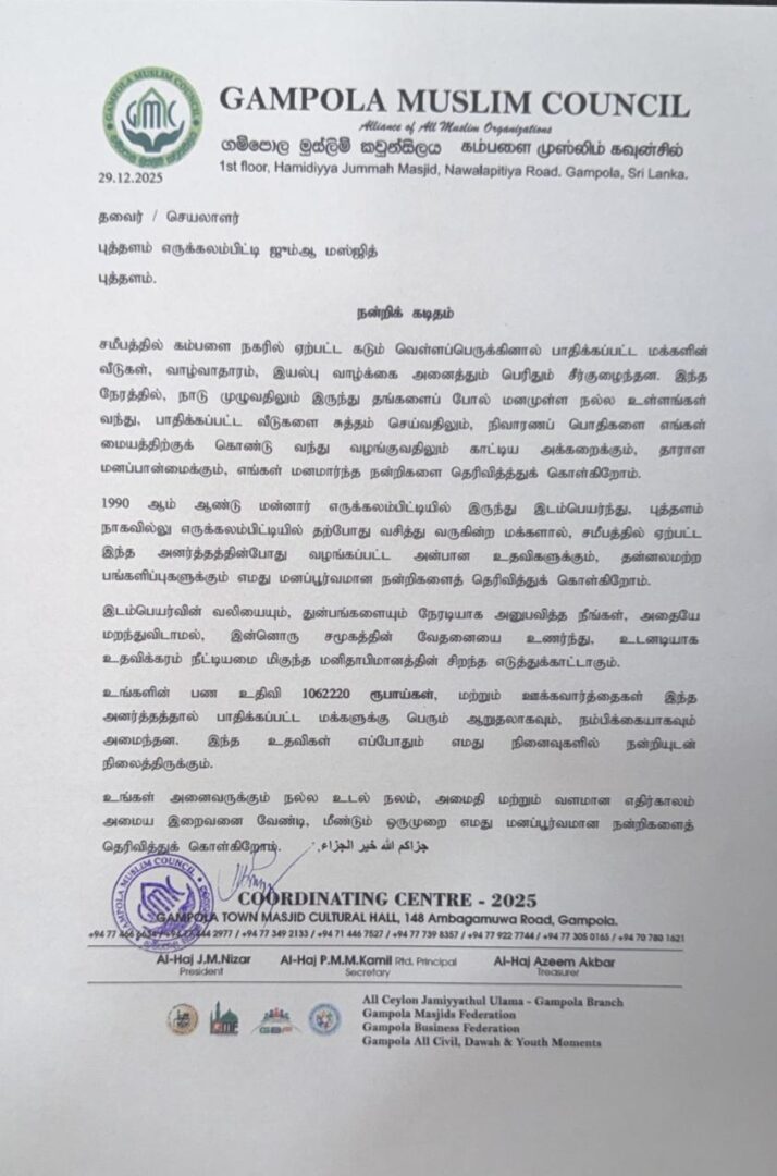 சமீபத்தில் கம்பளை நகரில் ஏற்பட்ட கடும் வெள்ளப்பெருக்கினால் பாதிக்கப்பட்ட மக்களின் வீடுகள், வாழ்வாதாரம், இயல்பு வாழ்க்கை அனைத்தும் பெரிதும் சீர்குழைந்தன. இந்த நேரத்தில், நாடு முழுவதிலும் இருந்து மனமுள்ள நல்ல உள்ளங்கள் வந்து, பாதிக்கப்பட்ட வீடுகளை சுத்தம் செய்வதிலும், நிவாரணப் பொதிகளை எங்கள் மையத்திற்குக் கொண்டு வந்து வழங்குவதிலும் காட்டிய அக்கறைக்கும், தாராள மனப்பான்மைக்கும் மனமார்ந்த நன்றிகளை தெரிவித்த்துக் கொள்வதாக கம்பளை முஸ்லீம் கவுன்சில் தெரிவித்துளளது.
