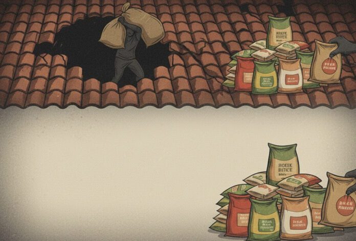 கூரை ஓடுகளை அகற்றி சுமார் 2 லட்சத்து 20ஆயிரம் ரூபா மதிப்புள்ள 55 உலர் உணவுப் பொருட்கள் அடங்கிய பொதிகள் யாரோ திருடியுள்ளதாக கிராம அலுவலர் நேற்று 27 ஆம் தேதி காவல்துறையில் புகார் அளித்தார்.