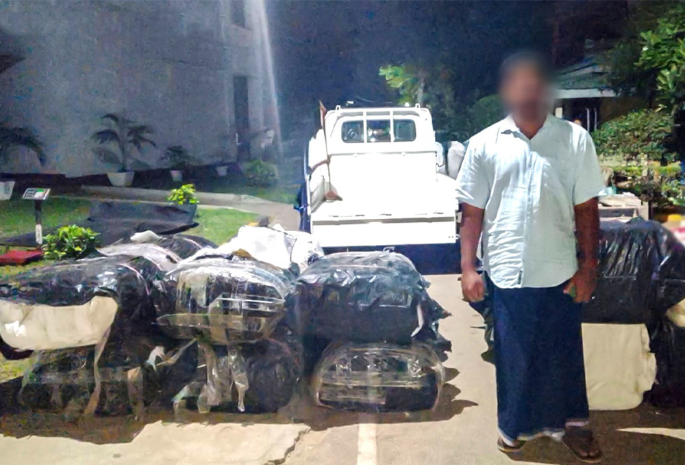 (379) கிலோ கிராமை விட அதிகமான பீடி இலைகள், (6000) வெளிநாட்டு சிகரெட்டுகள், (2,812,00) மருந்து மாத்திரைகள் மற்றும் (1291) மருந்து ஊசிகளுடன் சந்தேக நபர் ஒருவர் கைதுசெய்யப்பட்டுள்ளார்.