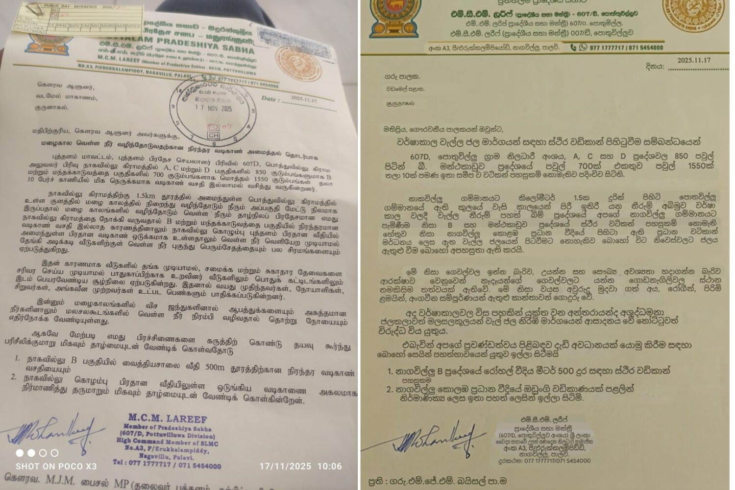 புத்தளம் நாகவில்லு கிராமத்தில் மழை காலங்களில் ஏற்படும் வெள்ள நீரினை வடிகான்கள் ஊடாக வெளியேற்ற முறையான வடிகான் வசதிகளை மேற்கொண்டு தருமாறு கோரி வடமேல் மாகாண ஆளுநரிடம் கோரிக்கை அடங்கிய மகஜர் ஒன்று இன்று 17.11.2025 திங்கட்கிழமை கையளிக்கப்பட்டது.