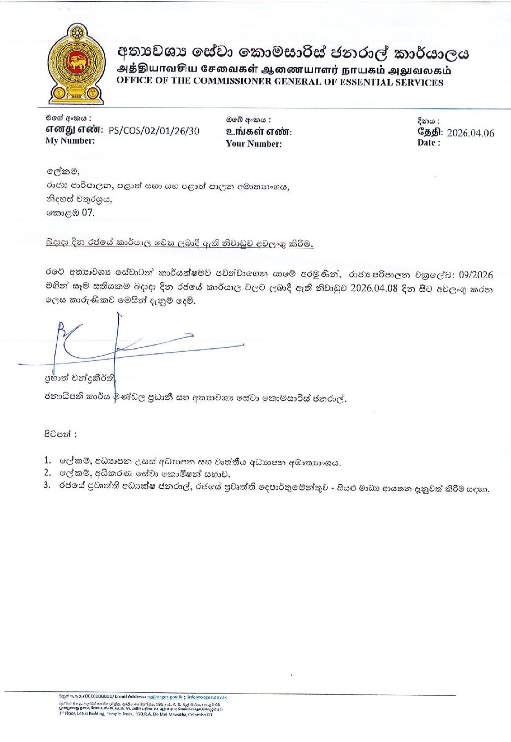 நாளை மறுதினம், அதாவது ஏப்ரல் 8ஆம் திகதி புதன்கிழமை முதல் இந்த புதிய தீர்மானம் நடைமுறைக்கு வரும் என அத்தியாவசிய சேவைகள் ஆணையாளர் நாயகம் பிரபாத் சந்திரகீர்த்தி தெரிவித்தார்.