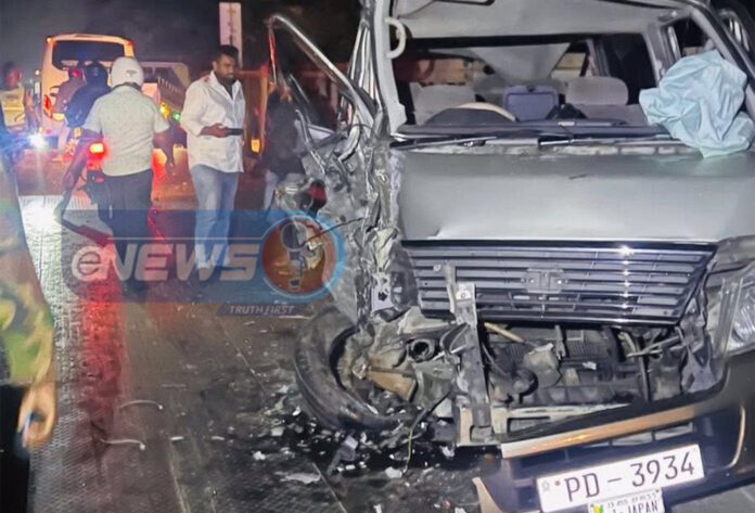 பட்டமளிப்பு விழாவிற்காக கொழும்புக்கு வந்த ஒரு குழுவினரை ஏற்றிச் சென்ற வேன், வவுனியாவிலிருந்து கொழும்பு நோக்கிச் சென்ற சொகுசு பேருந்து மீது நேருக்கு நேர் மோதியதில் இந்த விபத்து ஏற்பட்டதாக போலீசார் தெரிவிக்கின்றனர். விபத்தில் வேன் பலத்த சேதமடைந்துள்ளது.