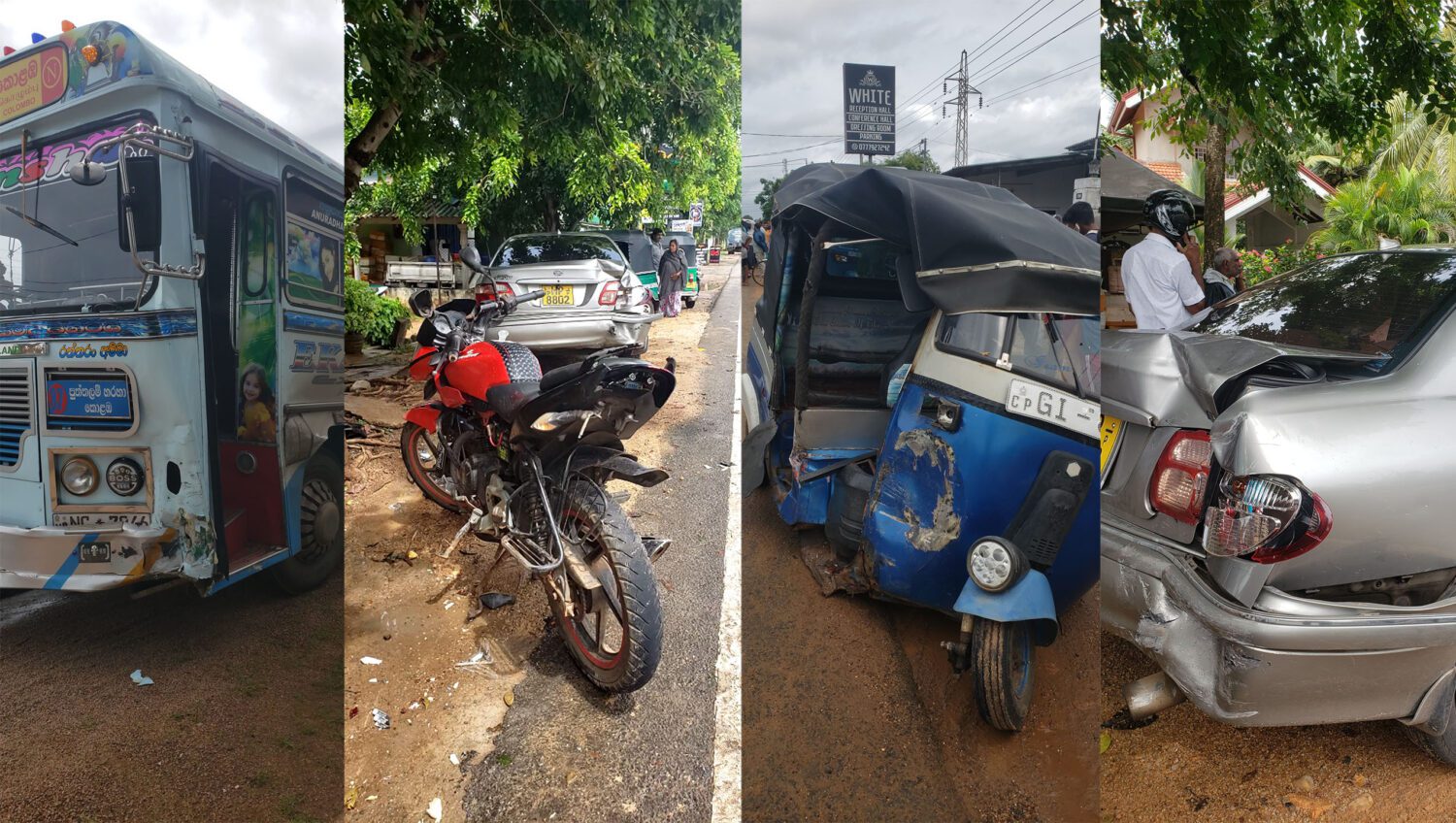 இவ் விபத்தில் முச்சக்கரவண்டி, தண்ணீர் பவுசர் வண்டி, தனியார் பஸ், மோட்டார் சைக்கிள் மற்றும் கார் ஆகிய வாகனங்கள் சேதமடைந்துள்ளன.