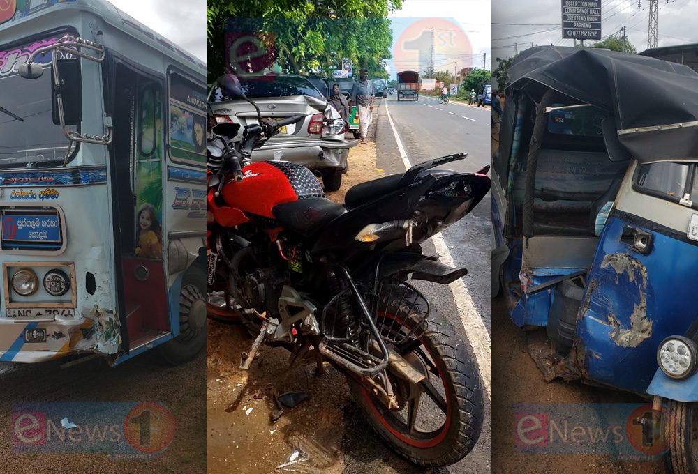 இவ் விபத்தில் முச்சக்கரவண்டி, தண்ணீர் பவுசர் வண்டி, தனியார் பஸ், மோட்டார் சைக்கிள் மற்றும் கார் ஆகிய வாகனங்கள் சேதமடைந்துள்ளன.