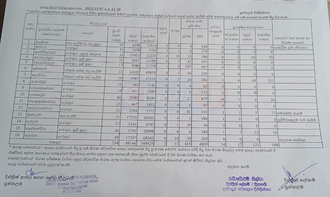அந்த வகையில் புத்தளம் மாவட்டத்தில் 534 கிராம சேவையாளர் பிரிவுகளுக்குற்பட்ட 98ஆயிரத்து 146 குடும்பங்கலைச் சேர்ந்த 3 லட்சத்து 49ஆயிரத்து 429 பேர் பாதிக்கப்பட்டுள்ளதாக குறித்த செயலகம் நேற்று வெளியிட்ட அறிக்கையில் தெரிவிக்கப்பட்டுள்ளது.