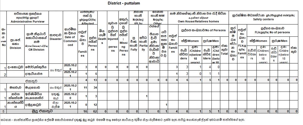 தொடர்ச்சியாக பெய்துவரும் கனமழை காரணமாக புத்தளம் மாவட்டத்தில் இதுவரை சுமார் 16 குடும்பங்களை சேர்ந்த 62 பேர் பாதிக்கப்பட்டுள்ளதாக தேசிய பேரிடர் நிவாரண சேவைகள் மையம் (NDRSC) வெளியிட்டுள்ள அறிக்கையில் தெரிவிக்கப்பட்டுள்ளது.