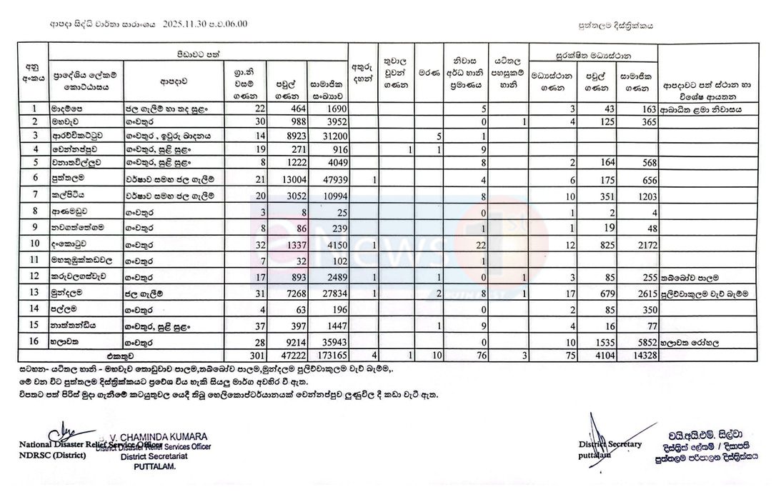 அந்த வகையில் புத்தளம் மாவட்டத்தில் 301 கிராம சேவையாளர் பிரிவுகளுக்குற்பட்ட 47ஆயிரத்து 222 குடும்பங்கள் பாதிக்கப்பட்டுள்ளதாக புத்தளம் மாவட்ட செயலகம் தெரிவித்துள்ளது.