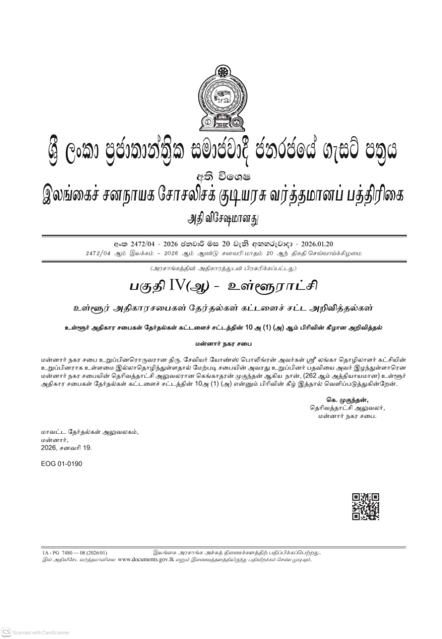 நீதிமன்றத் தீர்ப்பின்படி அவர் கட்சி உறுப்புரிமையை இழந்தமையால், அவர் தனது மன்னார் நகர சபை உறுப்பினர் பதவியையும் இழந்துள்ளதுடன், இது தொடர்பில் இன்று 21/01/2026 வர்த்தமானியில் (Gazette) அதிகாரப்பூர்வமாக கட்சியின் உறுப்புரிமையை இழந்துள்ளதாக பிரசுரிக்கப்பட்ட்டுள்ளமை குறிப்பிடத்தக்கது.